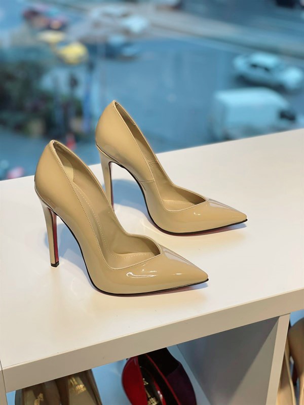 کفش مجلسی زنانه پاشنه بلند نوک تیز جلوباز کرم ورنی