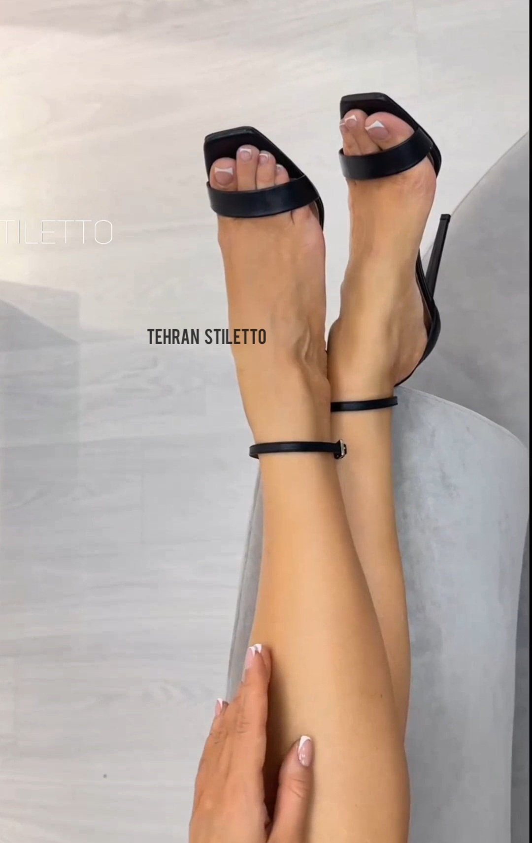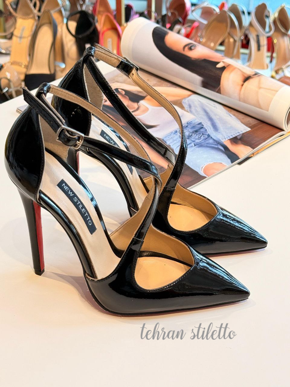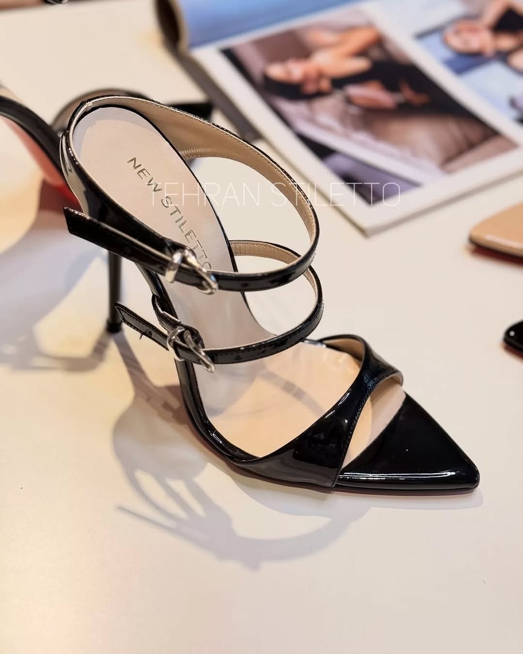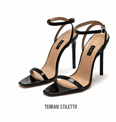 استلتو مجلسی زنانه دور مچ بنددار پاشنه دار نوک تیز مشکی ورنی