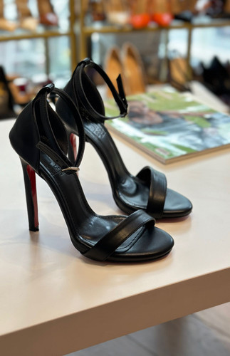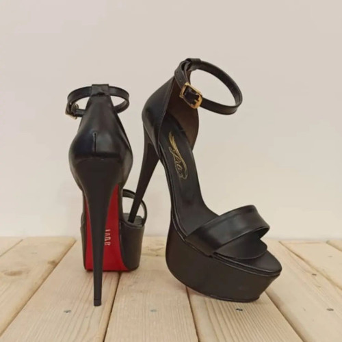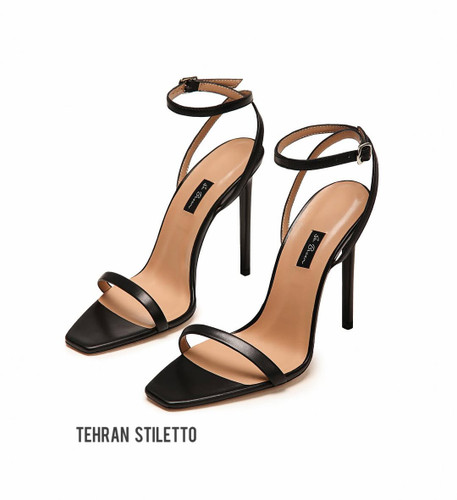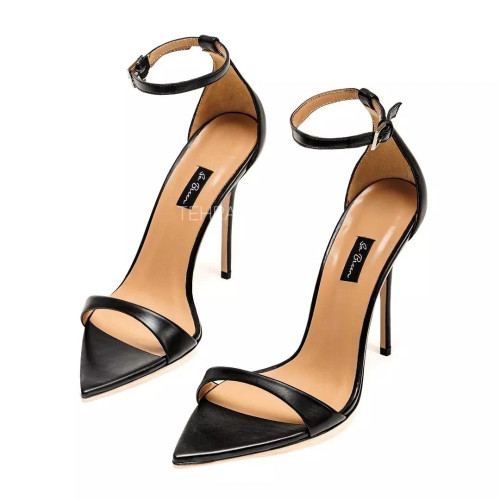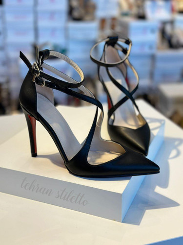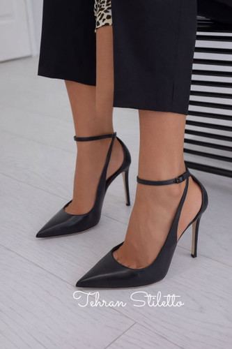 کفش پاشنه بلند مجلسی زنانه جلوباز دور مچ بنددار مشکی چرم