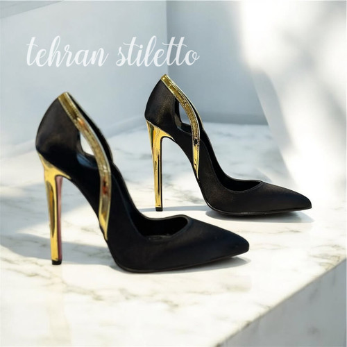 استلتو‌ مجلسی دو رنگ پاشنه دار نوک تیز طلایی مشکی ساتن
