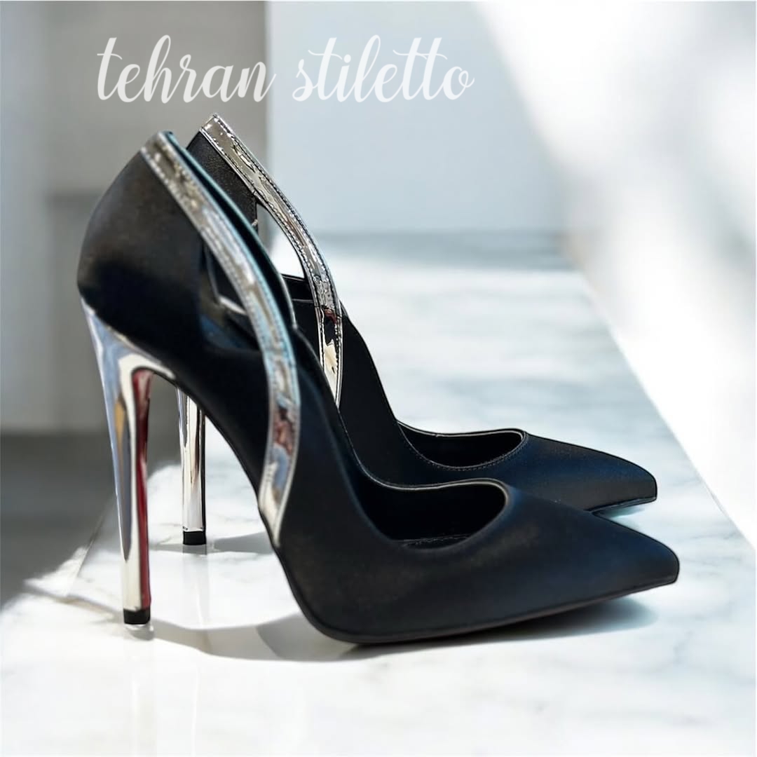 استلتو‌ مجلسی دو رنگ پاشنه دار نوک تیز نقره ای مشکی ساتن