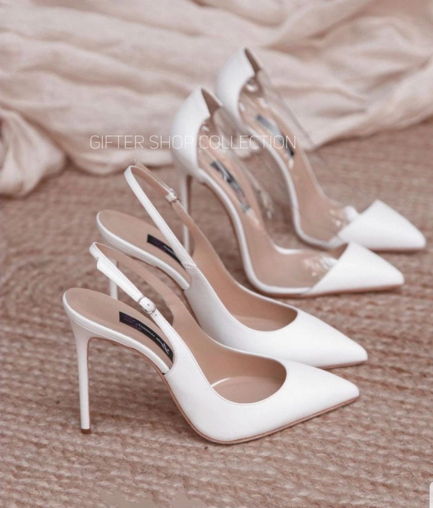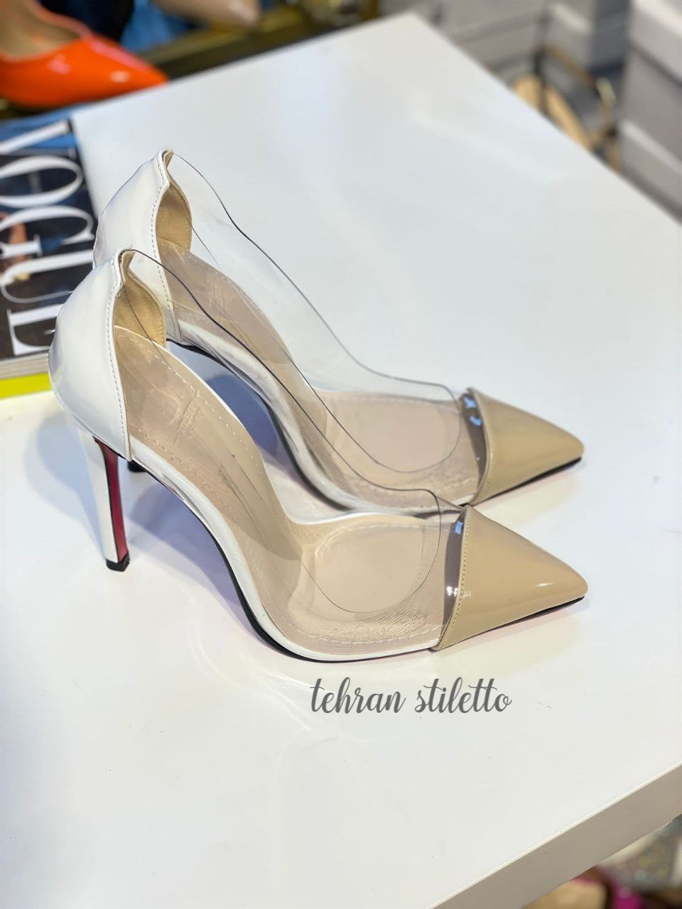 کفش مجلسی زنانه شیشه ای پاشنه دار نوک تیز سفید و کرم