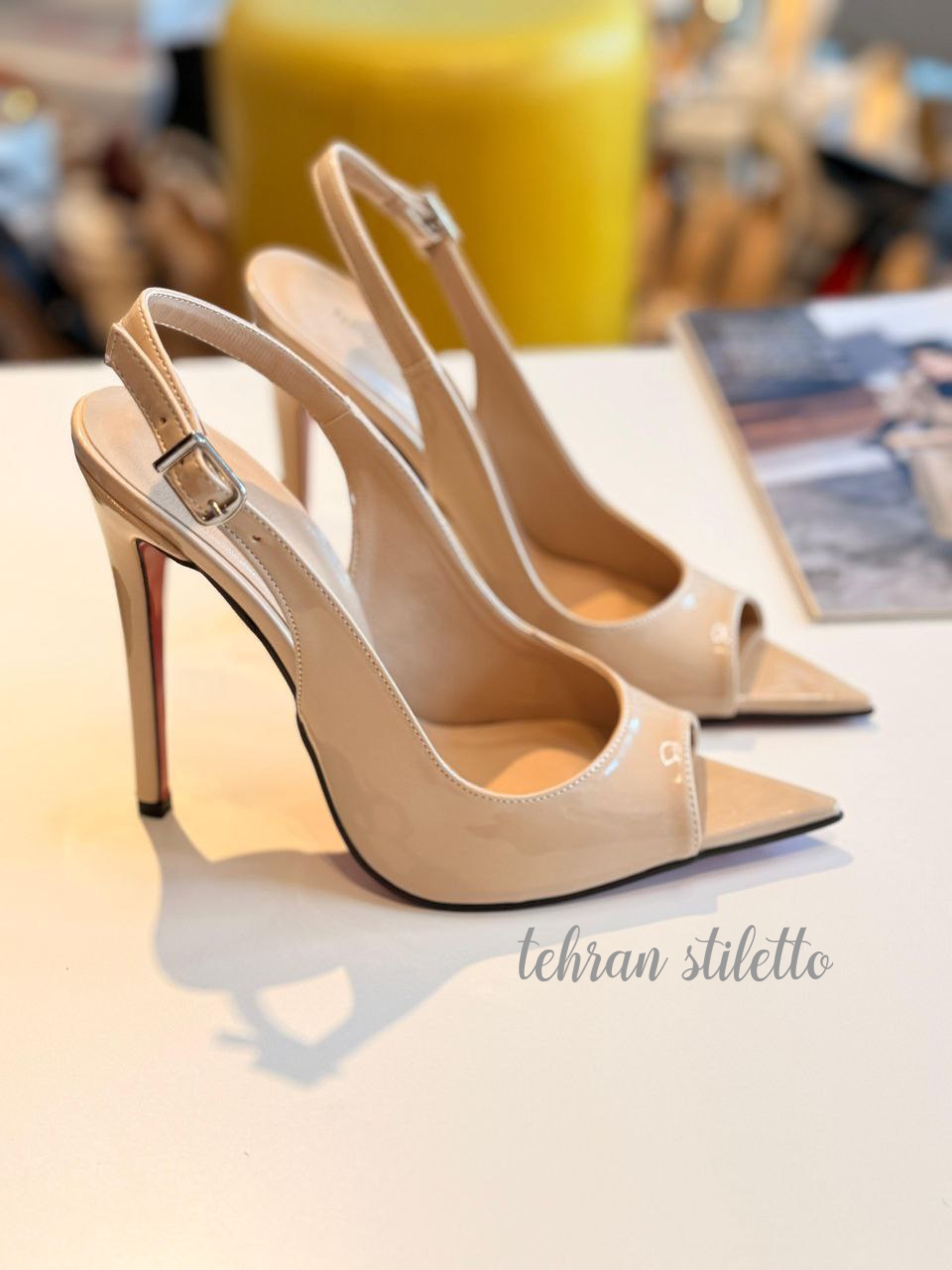 استلتو مجلسی زنانه پشت بنددار پاشنه دار نوک تیز کرم ورنی